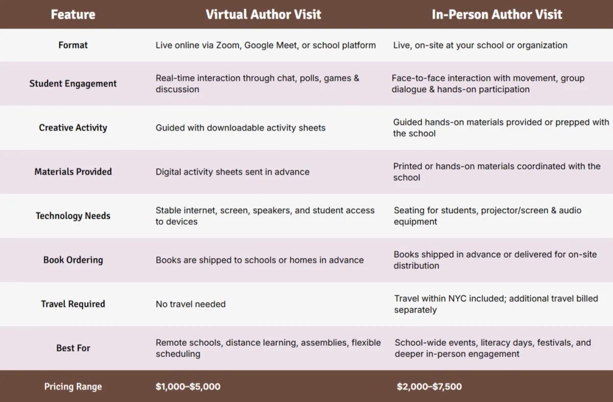 If your budget doesn't allow for travel expenses, we invite you to consider a virtual author visit as an accessible alternative
